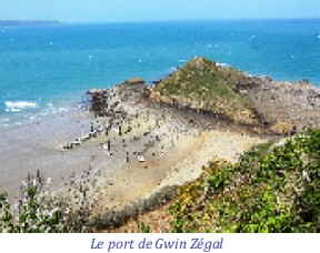 Au bout de la route de Kersalic, s'ouvre une anse rocheuse dominée par une pointe dominée par une pointe avancée et un rocher, une vue sur l'ensemble des falaises à couper le souffle. Toute la baie de Saint-Brieuc est devant nous, de Bréhat au Cap Fréhel. A l'abri de ces hauteurs se cache le petit port de Gwin Zégal, point de mouillage aménagé par des moines irlandais au Ve ou VIe siècle : les points d'attache sont faits de troncs d'arbres avec leurs racines bloquées par des pierres. On peut compter une cinquantaine de pieux...