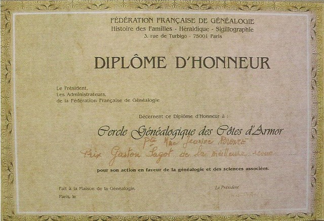 Au Congrès de Besançon, la Fédération Française de Généalogie (FFG) avait créé le Prix Gaston SAGOT, réservé à la meilleure revue de Cercle. Nous avons eu la grande satisfaction de voir notre bulletin, "Généalogie 22", couronné ex-aequo avec "Le Bordager".